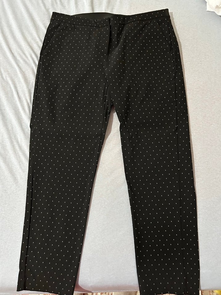 Düğmeli, siyah puantiyeli kadın kumaş pantolon, normal boy ve regular kesim, sentetik kumaştan, günlük kullanıma uygun.