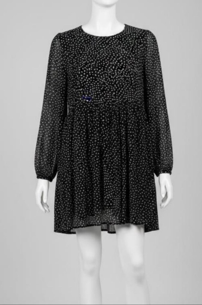 Düğmeli detaylı, uzun kollu, yuvarlak yakalı, siyah puantiyeli, sentetik kumaştan midi uzunlukta bol kesim elbise.