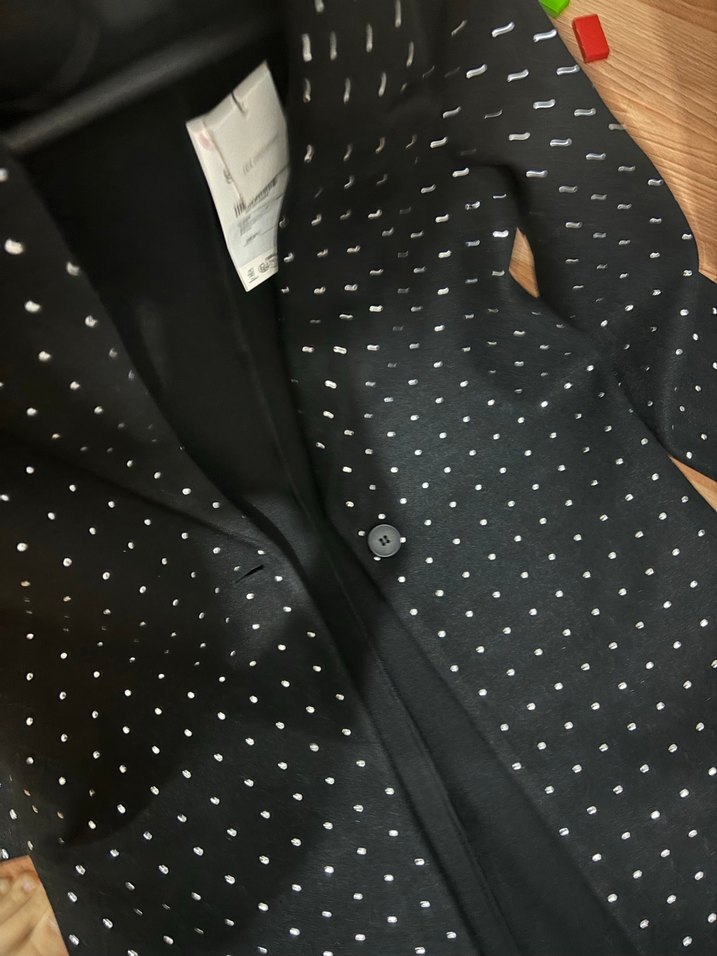 Siyah puantiyeli, düğmeli ve kruvaze yaka detaylı hamile ceketi. Uzun kollu, midi boyda ve regular fit kesime sahiptir.