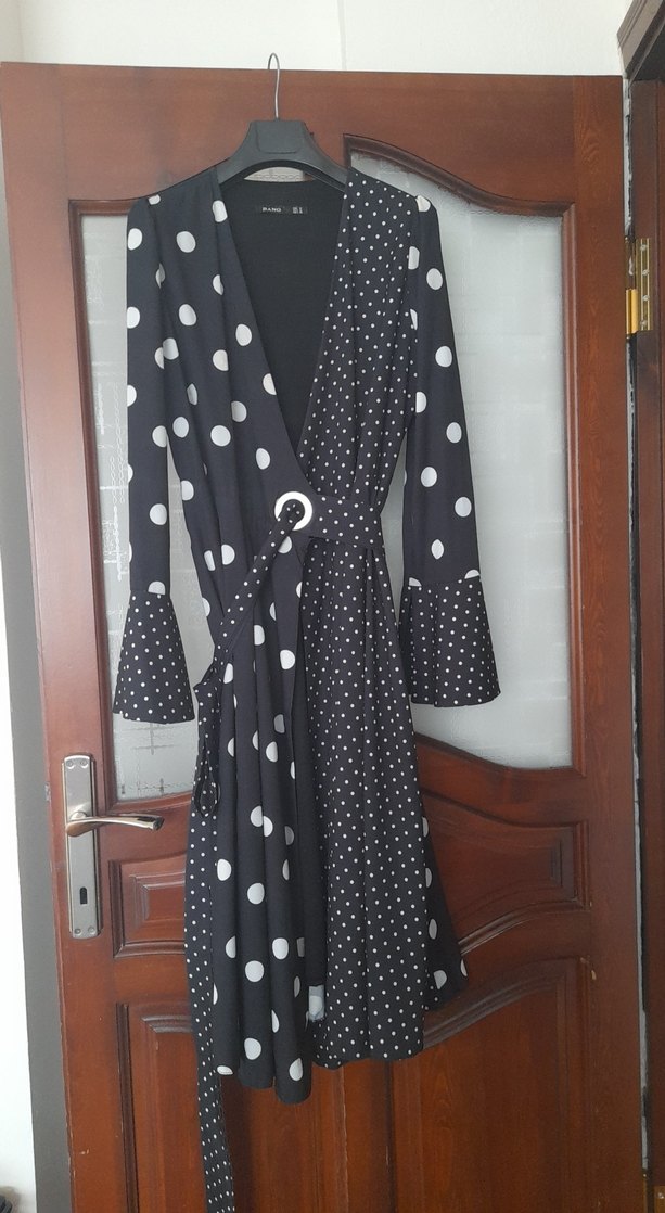Uzun kollu, kuşak detaylı siyah elbise, büyük ve küçük puantiyelerle regular kesim.hem tunik hem elbise olarak kullanılabilir çok şık