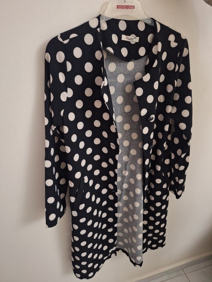 Siyah puantiyeli, düğmeli, uzun ve bol kesim kadın kabanı. Uzun kollu, kesik yaka ve sentetik kumaştan üretilmiştir. Günlük sokak stili için uygundur.