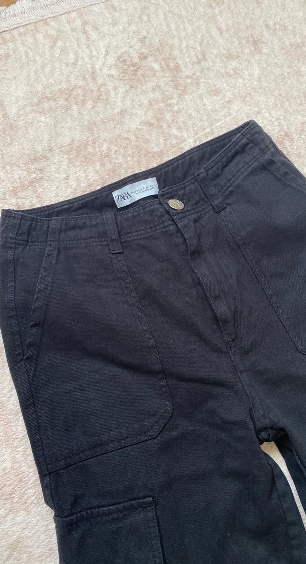 Düğmeli, siyah renk, rahat kesim kadın kot pantolon. Normal midi boyda, günlük kullanıma uygun desen içermeyen denim kumaş.