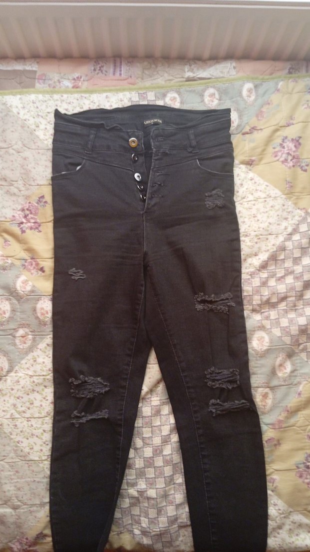 Düğmeli ve yırtık detaylı siyah denim kot pantolon. Rahat kesim ve midi boyda, günlük ve sokak stiline uygundur.