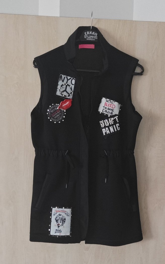 Düğmeli, baskılı punk patch detaylı siyah kolsuz yelek. Fitted kesim, normal midi boy ve straplez yaka. Günlük kullanıma uygun koyu ve asi tarz.