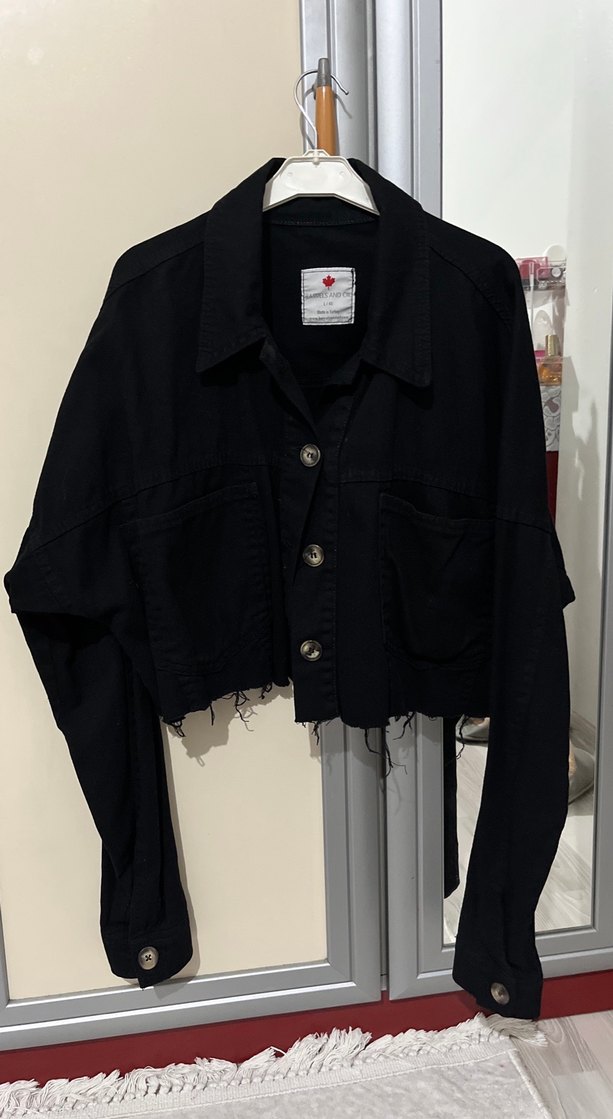 Siyah denim ceket, düğmeli ön, uzun kollu ve yaka detaylıdır. Salaş kesimi ve kısa boyuyla sokak stiline uygundur.