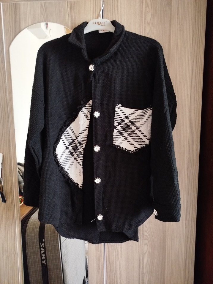 Uzun kollu, düğmeli, siyah salaş kadın gömlek. Notlu yaka ve desenli ceplerle detaylandırılmış, yumuşak dokulu kumaştan üretilmiştir.