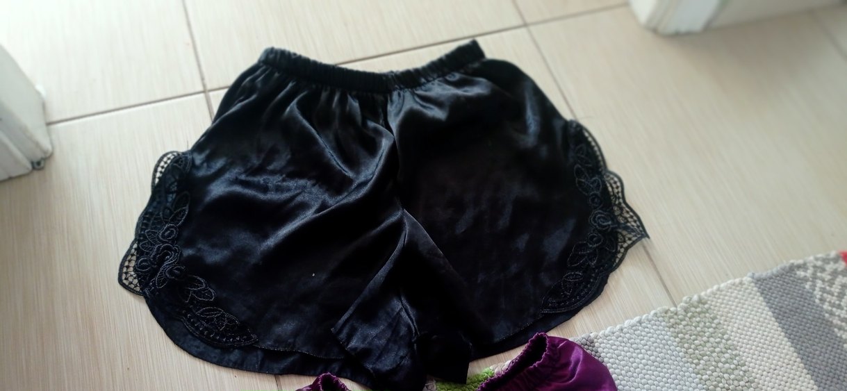 Düğmeli, siyah saten kumaştan, rahat kesimli hamile şortu. Gotik tarzıyla romantik anlara uygun.
