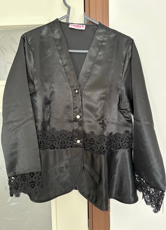 Düğmeli siyah saten kadın ceket, notalı yaka ve dantel detaylı uzun kollara sahiptir. Hiç kullanılmadı katlı dolapta durduğu için kırışık biraz . Pembesi internet görseli üzerinde duruş için eklenmiştir