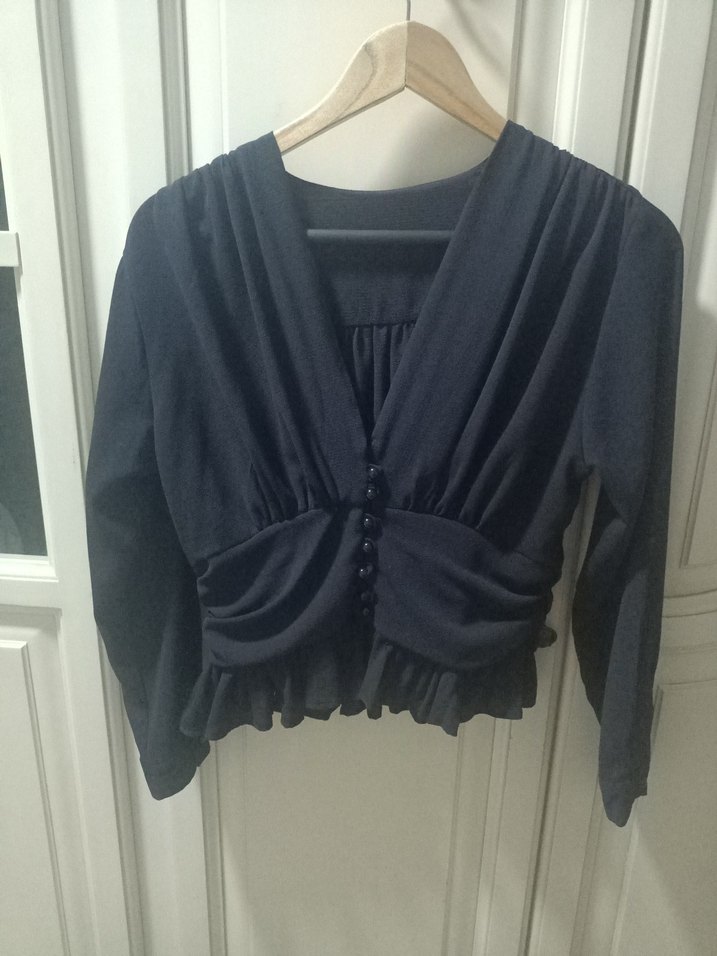 Uzun kollu, V yakalı ve düğmeli siyah şifon bluz. Gevşek kesim ve normal midi boyda, ofis için uygun gotik Paris tarzı.