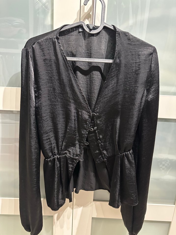 Düğmeli, uzun kollu, ipeksi kumaştan yapılmış, fitted kesim siyah bluz.