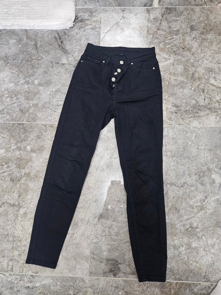 Düğmeli, siyah renk, dar kesim yüksek bel kadın jean.