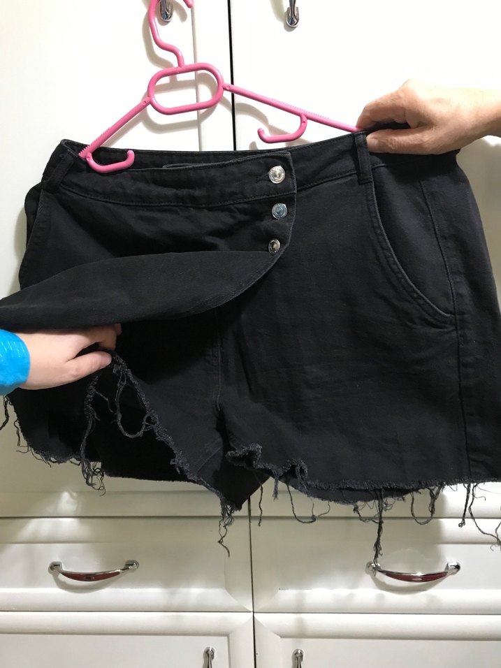 Düğmeli kapama ve gevşek kesime sahip siyah kot midi şort, yıpranmış uçlarıyla grunge tarzını yansıtır.
