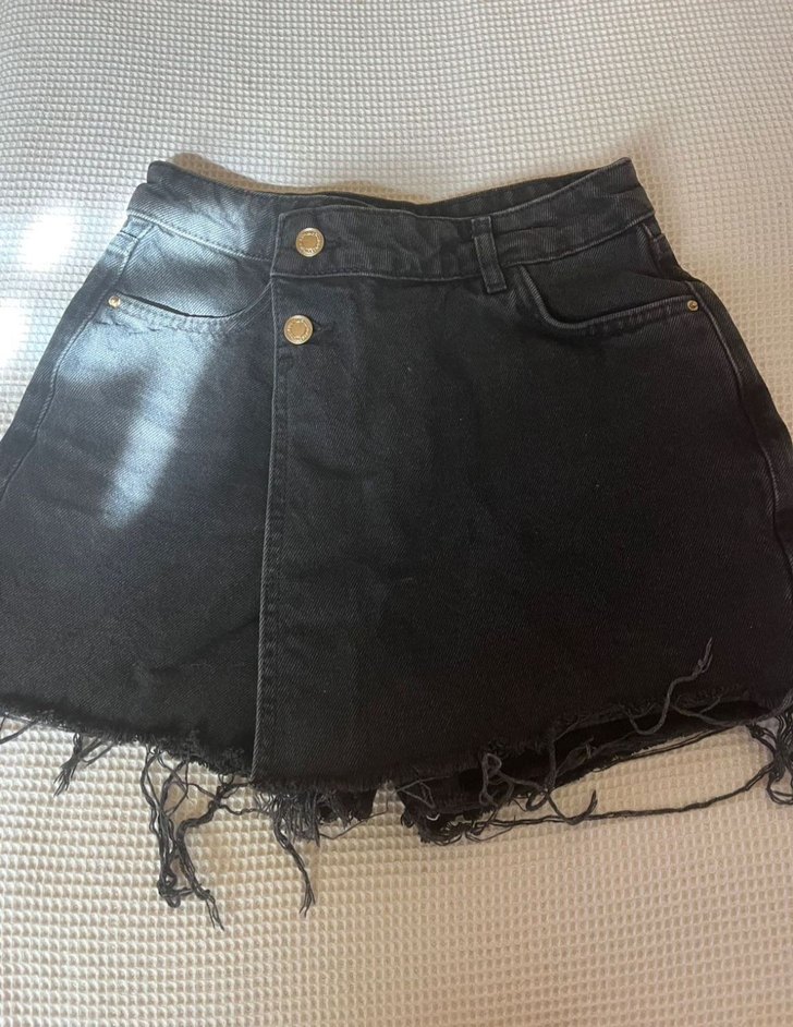 Düğmeli, bol kesim siyah mini kot etek. Püsküllü etek ucu grunge punk tarzı yansıtıyor. Günlük kullanıma uygun