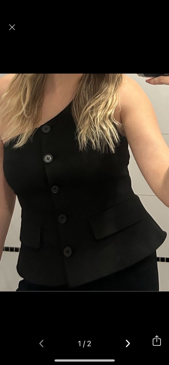 Düğmeli, siyah straplez kadın yelek. Normal uzunlukta, kolsuz ve sentetik kumaştan. İş ortamı için goth tarzında, rahat kesim.