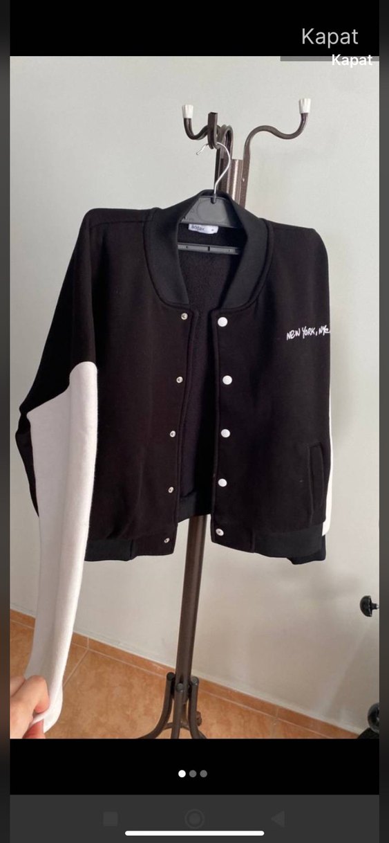 Düğmeli, uzun kollu, bol kesim siyah ceket. Beyaz baskılı detaylara ve yumuşak, sıcak kumaşa sahip, günlük rahat kullanım için uygun.