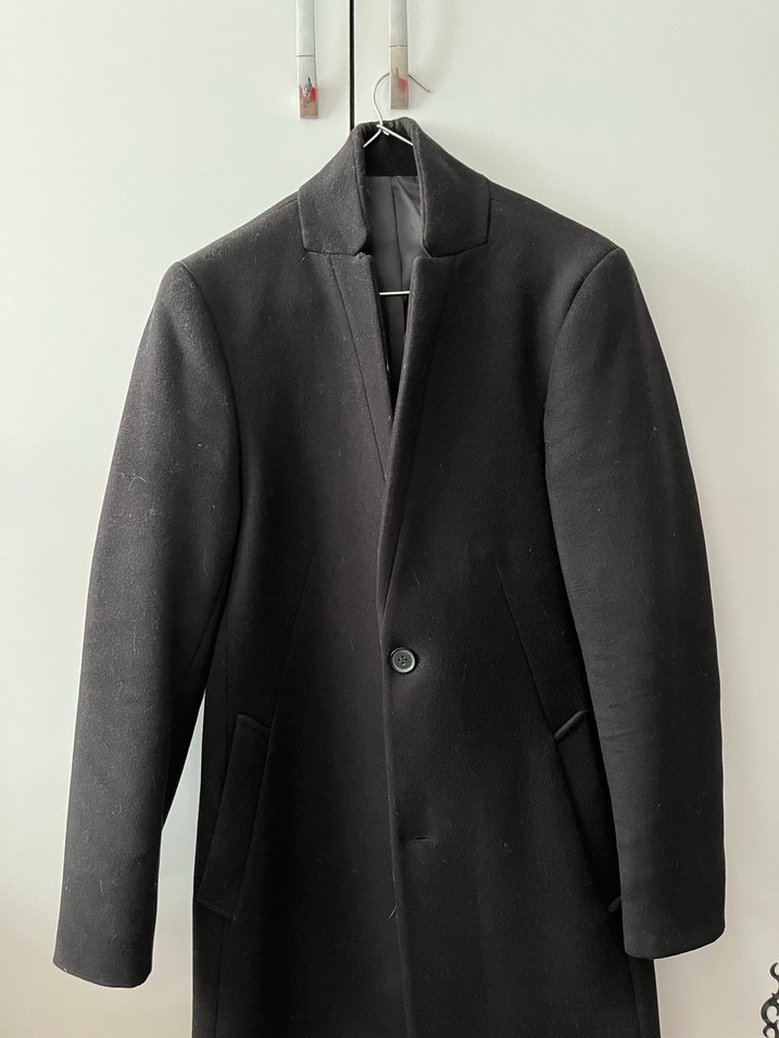 Düğmeli, siyah süet kumaştan yapılmış, normal boy ve regular fit erkek kaban. Uzun kollu, ofis için uygun.