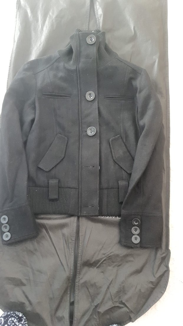 Düğmeli, siyah süet kumaştan yapılmış, notalı yakalı ve uzun kollu, midi boyda, dar kesim kadın ceket.