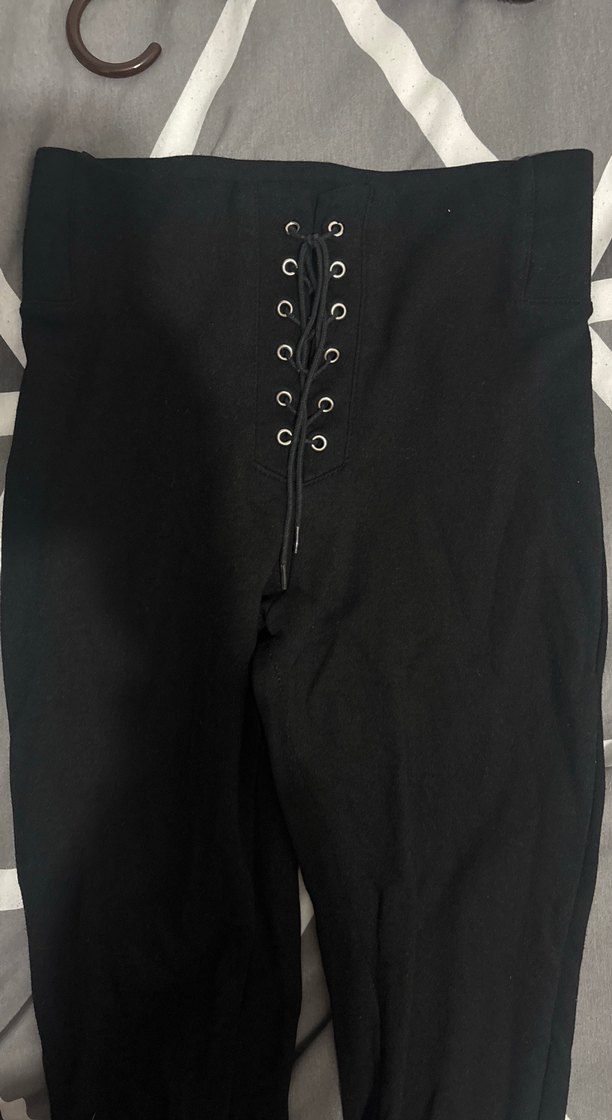 Düğmeli bağcıklı ön detaylı, midi boyda, siyah süet kumaştan yapılmış, vücuda oturan cesur gotik tarzda kadın pantolonu.