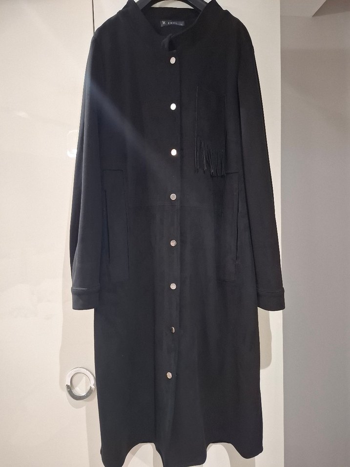 Düğmeli siyah süet uzun kadın kaban, regular kesim ve uzun kolludur. Ofis için uygun, trend günlük tarzda, kesik yakalıdır. üründe hiçbir sorun yoktur kullanılmadığım için satıyorum