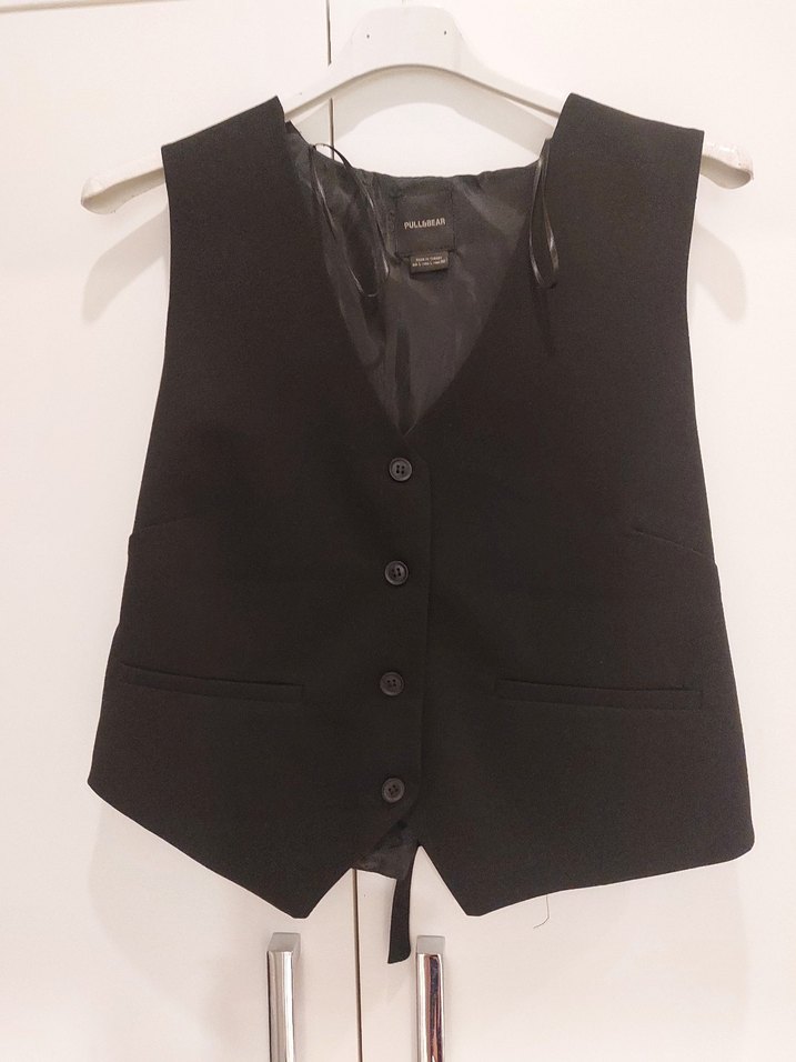 Düğmeli, siyah süet kumaştan, kolsuz ve kesimli yakalı kadın yelek. Ofis için uygun midi boyda, rahat kesim ve gotik tarzda.