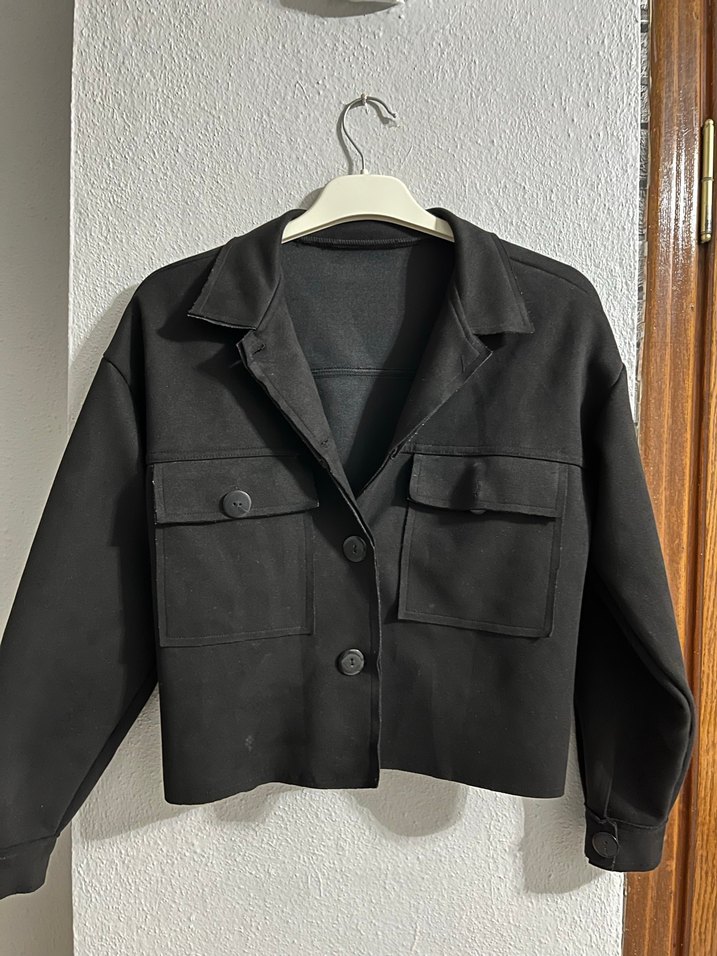 Düğmeli, siyah süet kumaştan kısa kesim kadın ceketi. Notlu yaka ve uzun kollu, minimalist tarzda, günlük sokak giyimine uygun.