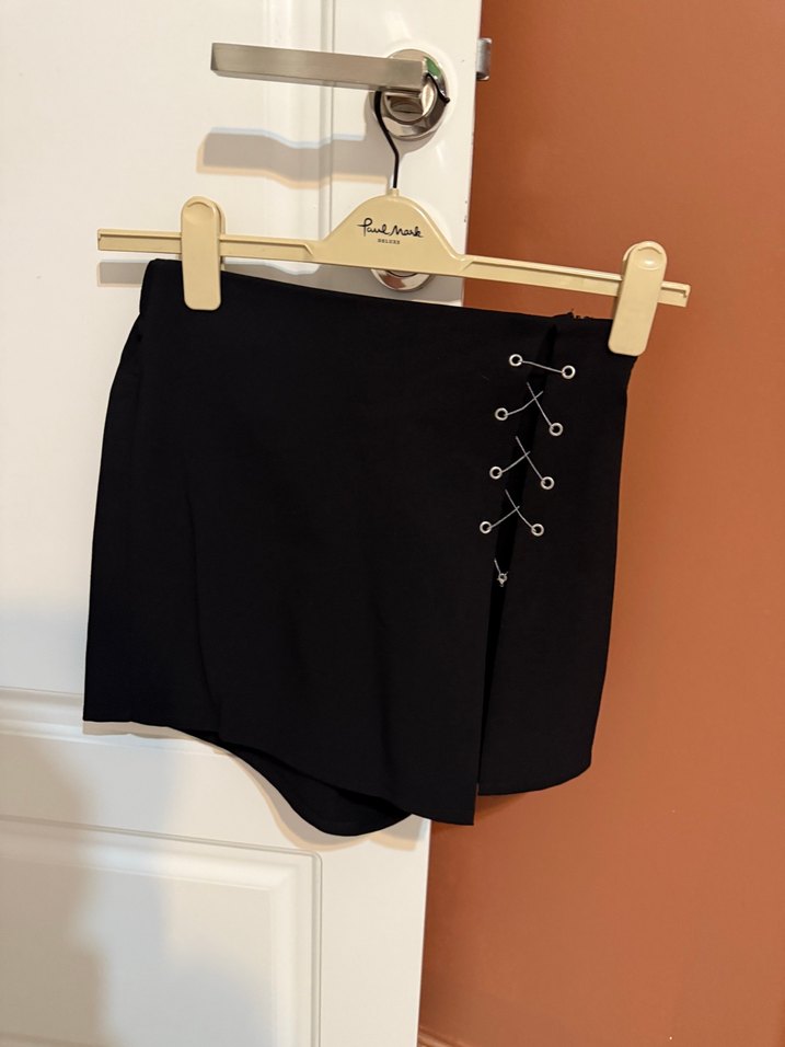 Düğmeli ve nakış detaylı, siyah süet kumaştan yapılmış, vücuda oturan mini etek.