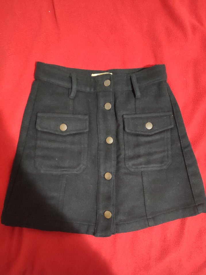Ön düğmeli ve cepli, siyah süet dokulu, dar kesim mini etek. Günlük sokak stiline uygun şık bir tasarım.
