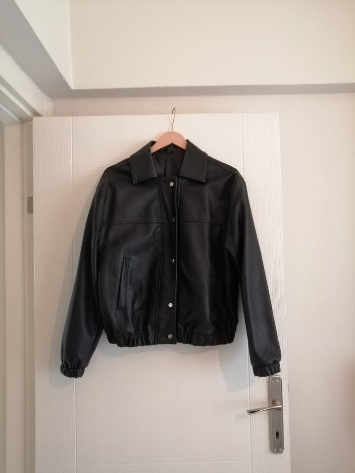 Çıtçıt düğmeli, siyah deri kadın ceket, kesik yaka ve uzun kolludur. Gevşek kesimi ve normal boyu ile günlük kullanıma uygundur. Çok az giydim, soğuklara uygun değil mevsimlik defosuz
