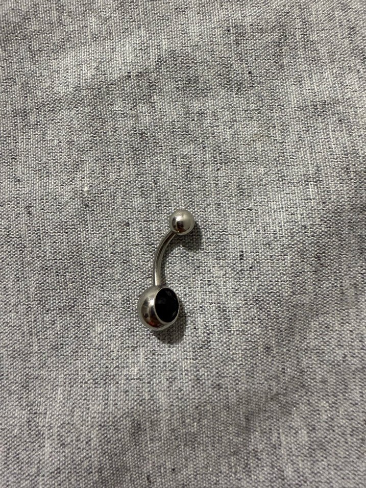 Düğmeli, siyah taşlı kadın göbek piercingi, minimalist ve rock punk tarzında, gri ve siyah tonlarda. Titanyum orijinal