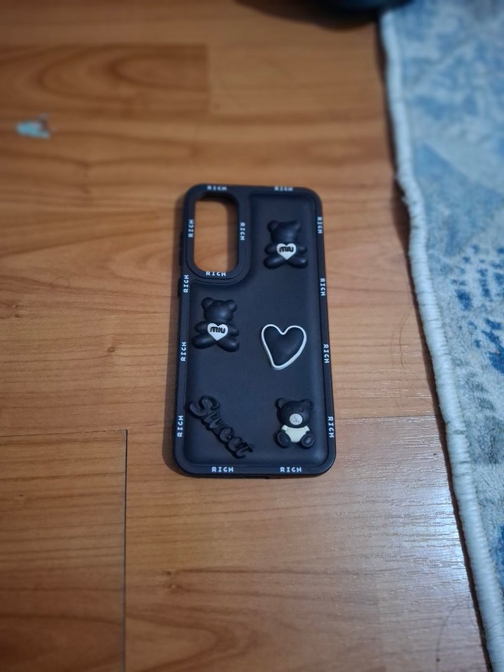 Siyah renkli,düğmeli ayıcık ve kalp süslemeleri bulunan telefon kılıfı.