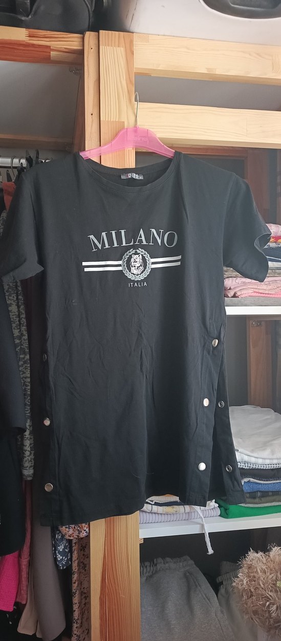 Siyah tişört, kısa kollu ve yuvarlak yakalıdır. Yanlarda düğme detayları ve önünde "MILANO" baskısı vardır. Pamuklu kumaştan, rahat kesimdir.