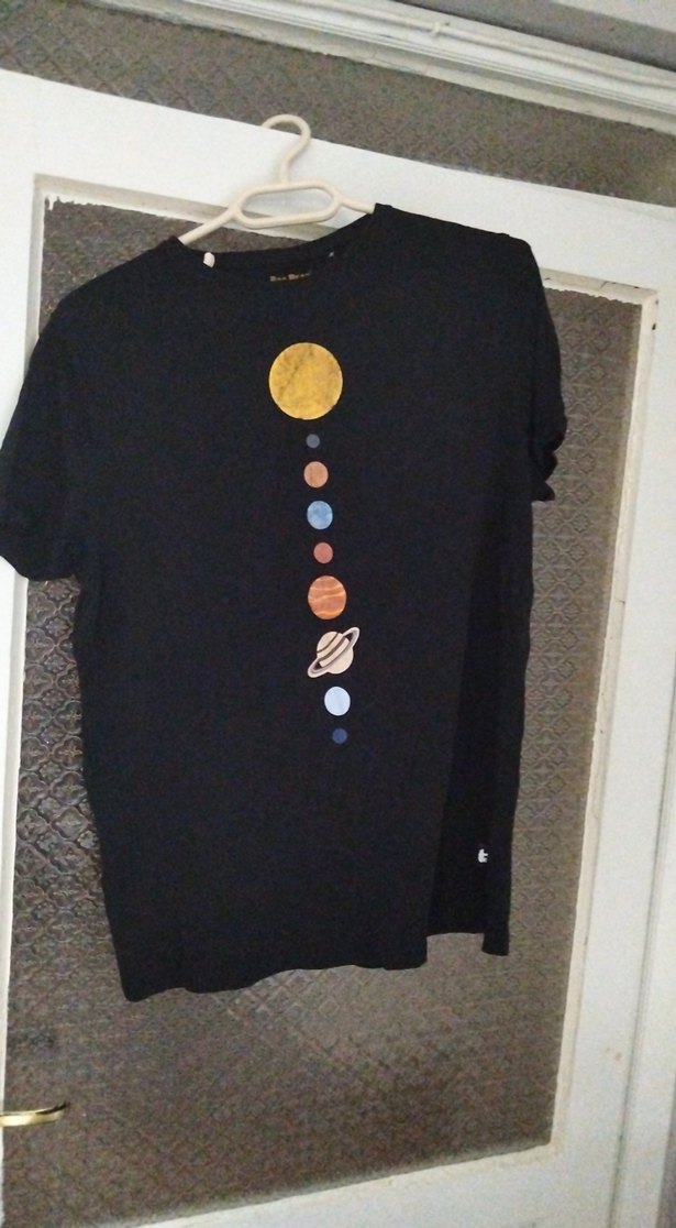 Düğmeli, kısa kollu, yuvarlak yaka siyah hamile tişörtü. Önünde güneş sistemi baskısı ve yanlarda düğme detayları vardır. Günlük rahat kullanım için yumuşak kumaştan.