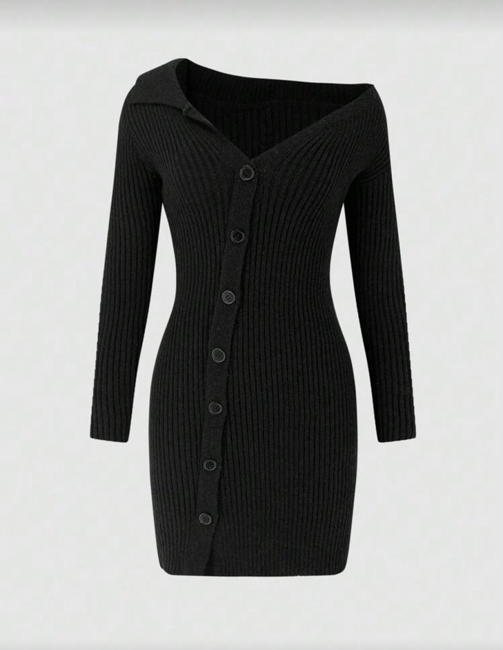 Düğmeli, V yaka, uzun kollu siyah triko midi elbise, rahat ve şık gotik tarzda günlük kullanım için uygundur.