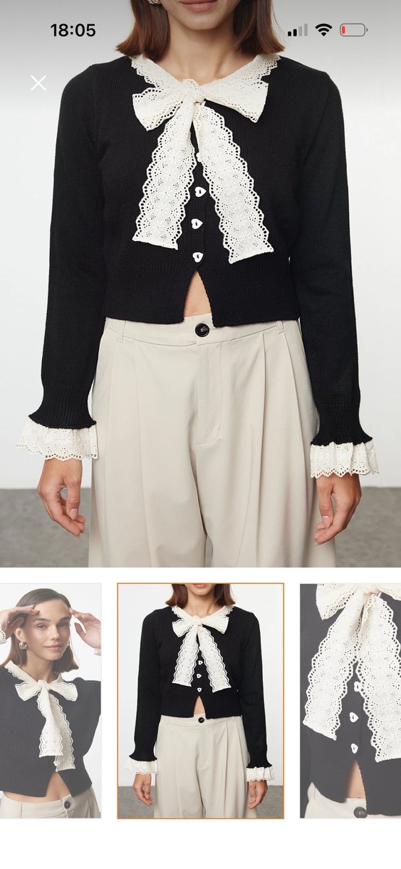Düğmeli, siyah triko hırka, yakada ve manşetlerde dantel detaylarıyla. Rahat kesimli, uzun kollu ve şık bir ofis görünümü için idealdir.