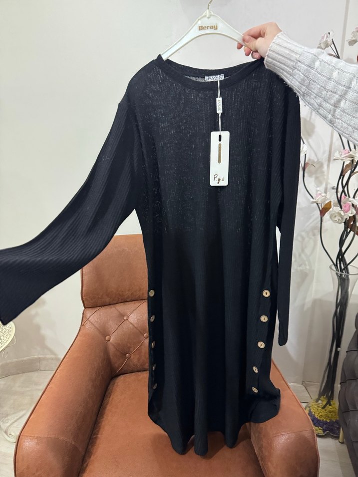 Düğmeli, uzun kollu, bisiklet yaka ve bol kesim siyah triko elbise. Sokak stili ve günlük kullanım için uygundur. M/l bedendir