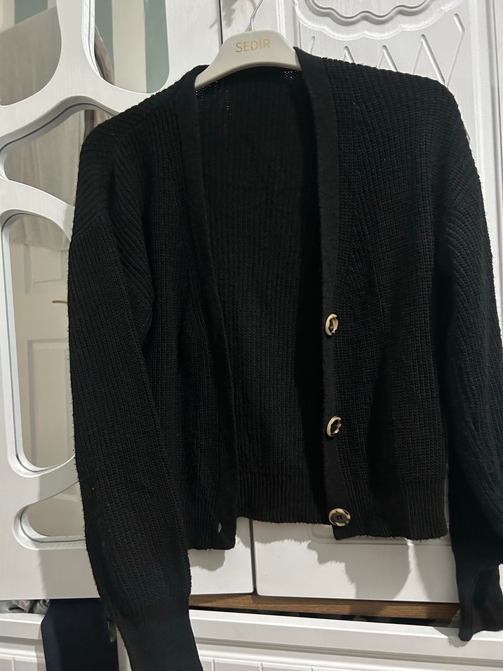 Düğmeli, siyah triko kadın hırka, uzun kollu ve kesimli. Notch yakalı, midi boyda, sokak stiline uygun rahat bir parçadır.