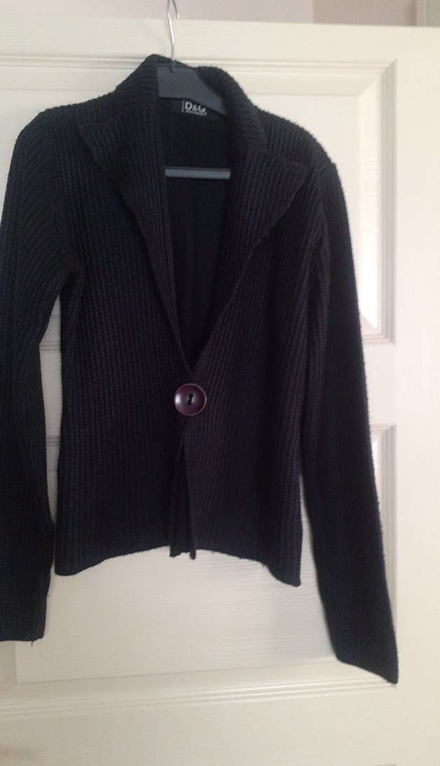 Düğmeli, yakalı ve uzun kollu siyah triko hırka, ceket ofis için uygun, rahat goth tarzda ve vücuda oturan kesimde.