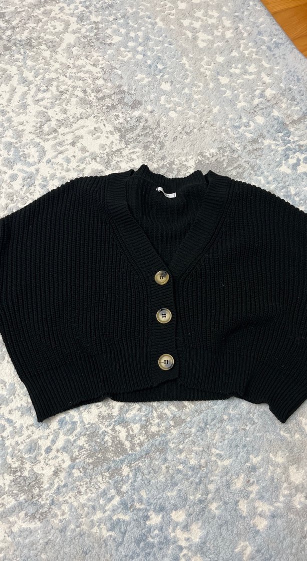 Düğmeli, siyah triko hırka ve uzun kolludur. Rahat kesimi ve midi boyu ile günlük kullanıma uygundur.