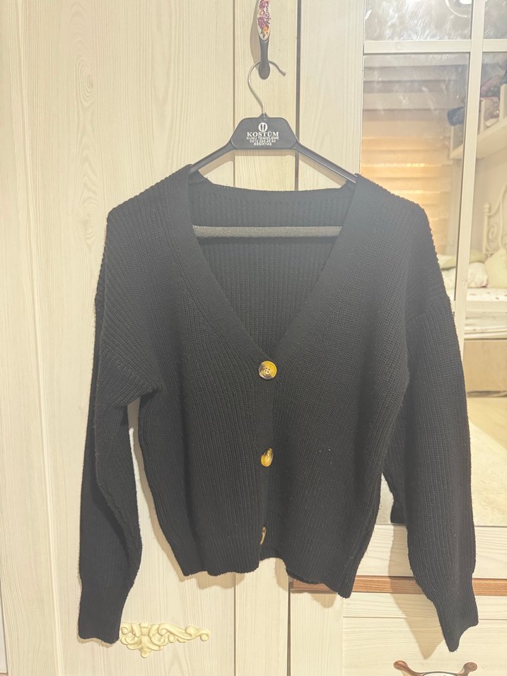 Düğmeli, V yakalı siyah triko kadın hırka, uzun kollu ve bol kesimdir. Rahat ve günlük kullanıma uygundur.
