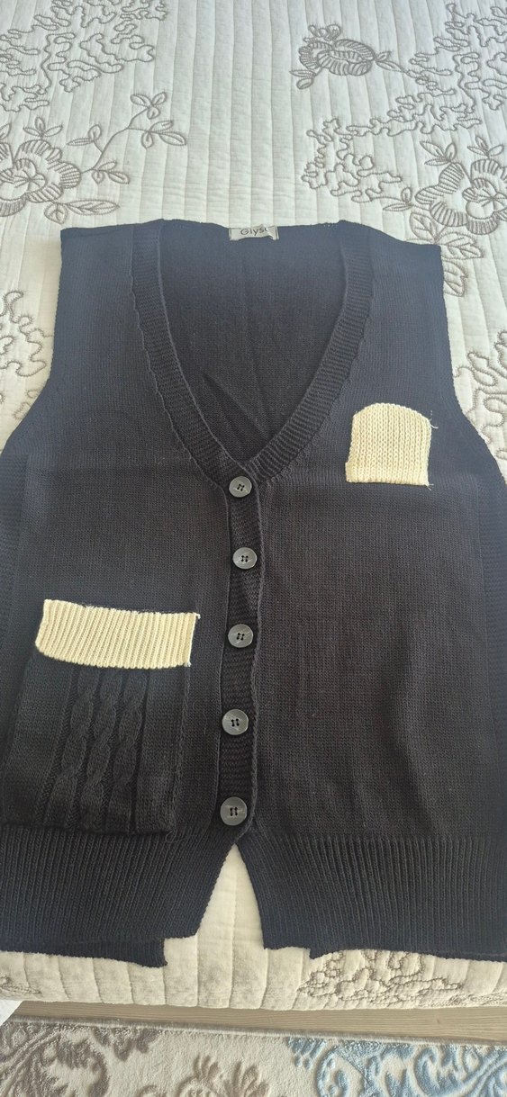 Düğmeli, siyah triko kadın yelek, kesik yakalı ve fitted kesime sahip. Kontrast krem ceplerle gotik tarzda.