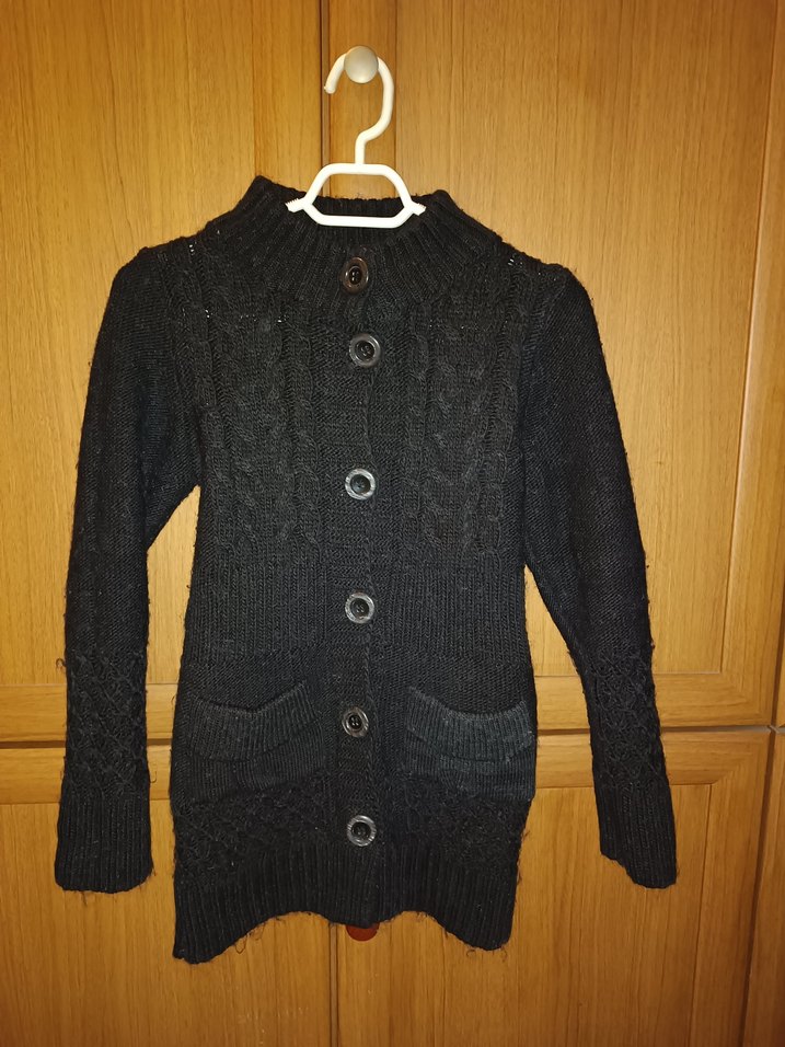 Bu siyah triko kız çocuk hırka, yüksek yakalı, uzun kollu ve vücuda oturan midi boydadır. Düğmeli ve ön cepli, günlük kullanıma uygun rahat ve trend goth tarzı sunar. ölçülerini sorabilirsiniz.