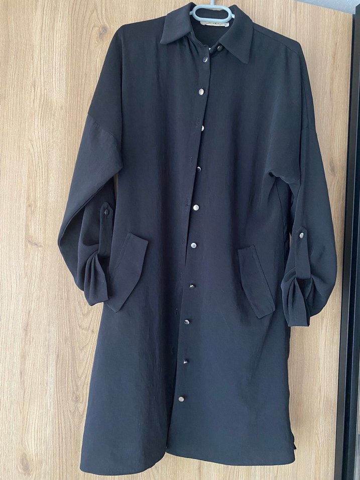 Düğmeli, uzun kollu, siyah tunik.Rahat kesim ve yakalı, sentetik kumaştan, ofis ve günlük kullanıma uygun. Defosu yoktur ütü istemez yıka giy bir kumaş