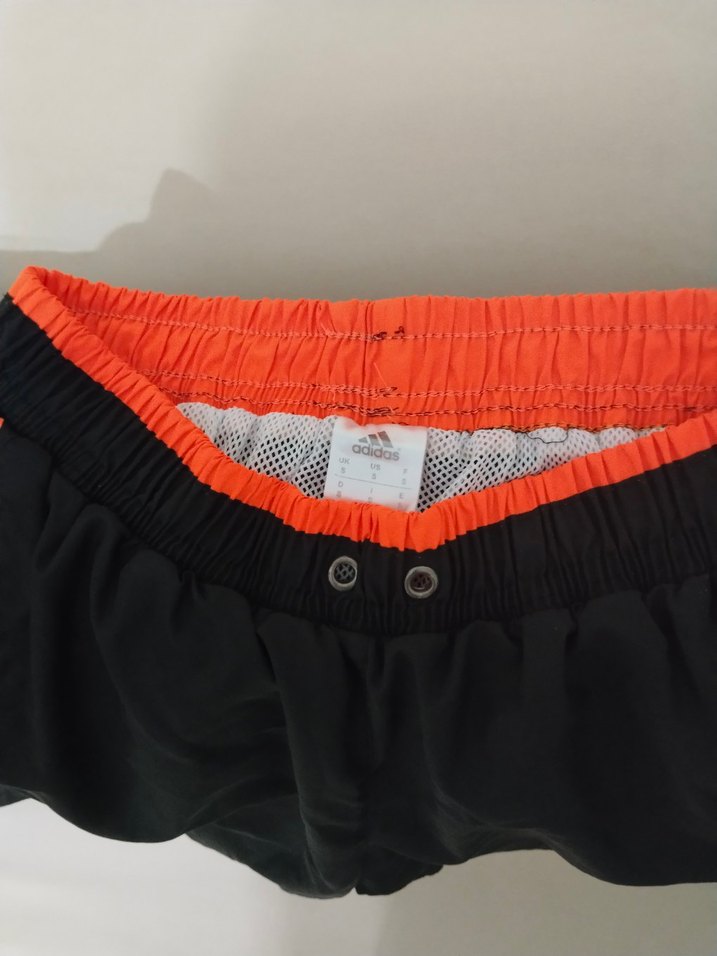 Düğmeli, siyah ve turuncu renkli, vücuda oturan erkek mayo. Normal midi boyunda, spor ve sokak stili için uygun.
