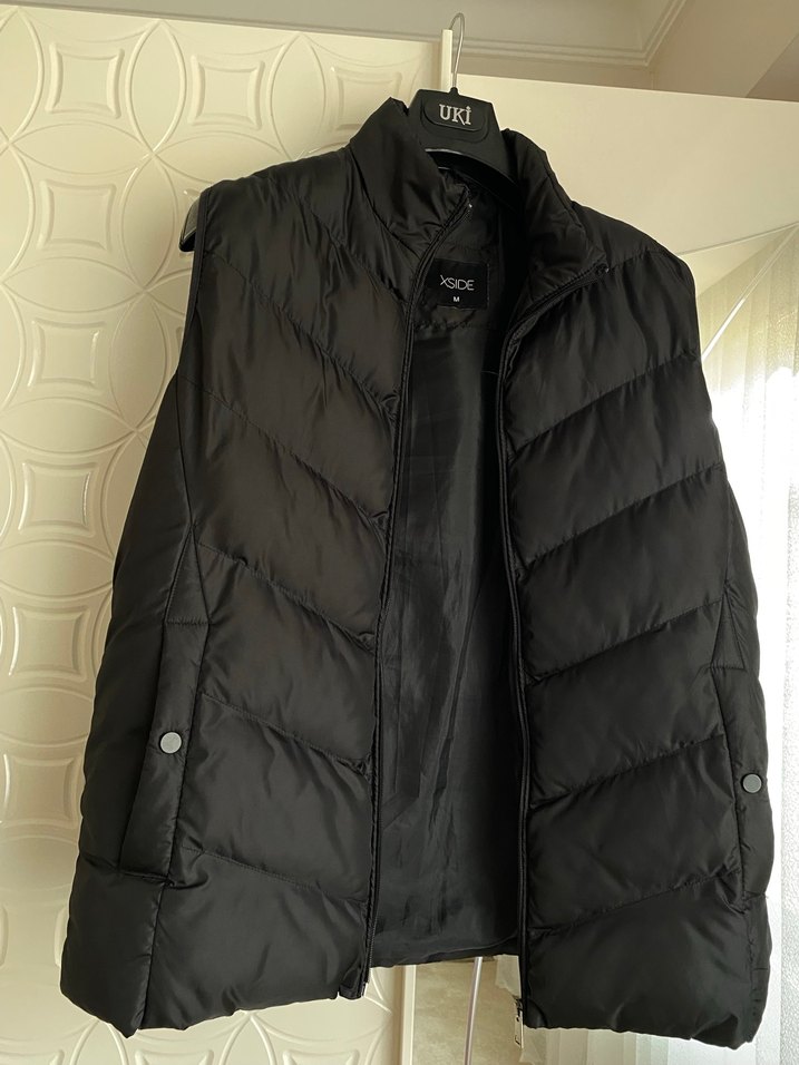 Siyah, fermuarlı, cepleri düğmeli ,yüksek yakalı, midi uzunlukta, sentetik kumaştan Unisex yelek. Trend ve rahat sokak stili için uygun.
