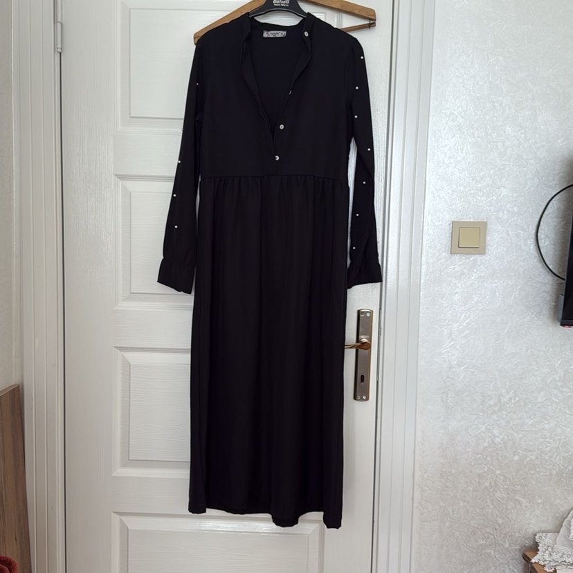 Siyah uzun akrilik elbise, düğmeli, bol kesim ve V yaka ile minimalist goth stilinde, günlük kullanıma uygun. Hiç kullanmadı.