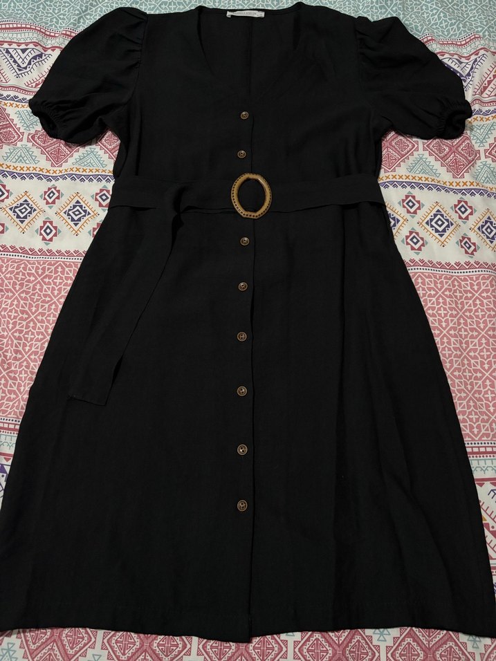 Siyah bohem elbise, V yakalı, kısa balon kollu ve bol kesimdir. Önden düğmeli, nakış detaylı ve belde kemerli. Sentetik kumaştan, günlük kullanıma uygun.