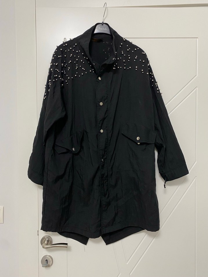 Hem Düğmeli hemde fermuarlı uzun kollu, siyah uzun ceket. Omuzlarda inci görünümlü süslemeler bulunur. M-L beden uyumludur ölçüleri resimde mevcut