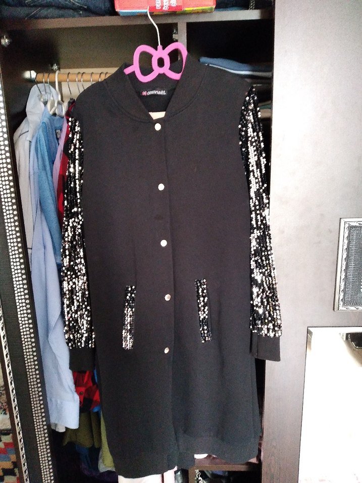Düğmeli, uzun kollu, siyah ceketNotched lapel yakalı, bol kesim ve sentetik kumaştan günlük kullanım için uygundur. bir düşmesinin iç kısmı düşmüş ama kullanıma engel degildir