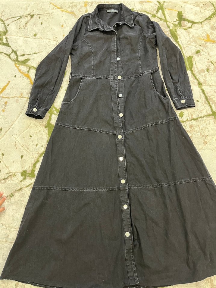 Düğmeli önü ve kesik yaka detaylı uzun siyah denim elbise. Bol kesimi ve uzun kollu yapısıyla bohem stil sunar, günlük kullanıma uygundur.