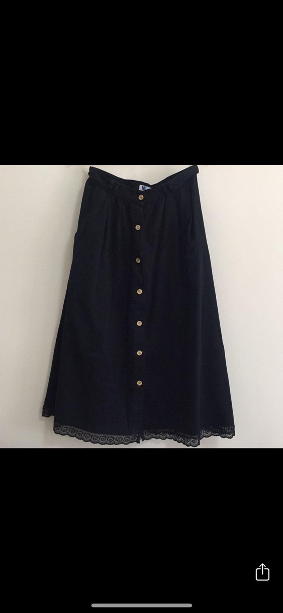 Düğmeli ön kısmı ve bol kesimi olan siyah uzun denim etek. Vintage goth tarzında, desensiz ve günlük kullanım için uygundur.